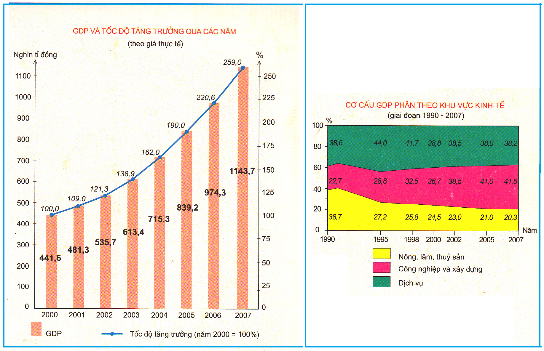 – Trên bản đồ thể hiện được quy mô và cơ cấu GDP phân theo các khu vực kinh tế của các trung tâm kinh tế, GDP bình quân tính theo đầu người của các tỉnh năm 2007. GDP và tốc độ tăng trưởng kinh tế qua các năm từ 2000 – 2007.