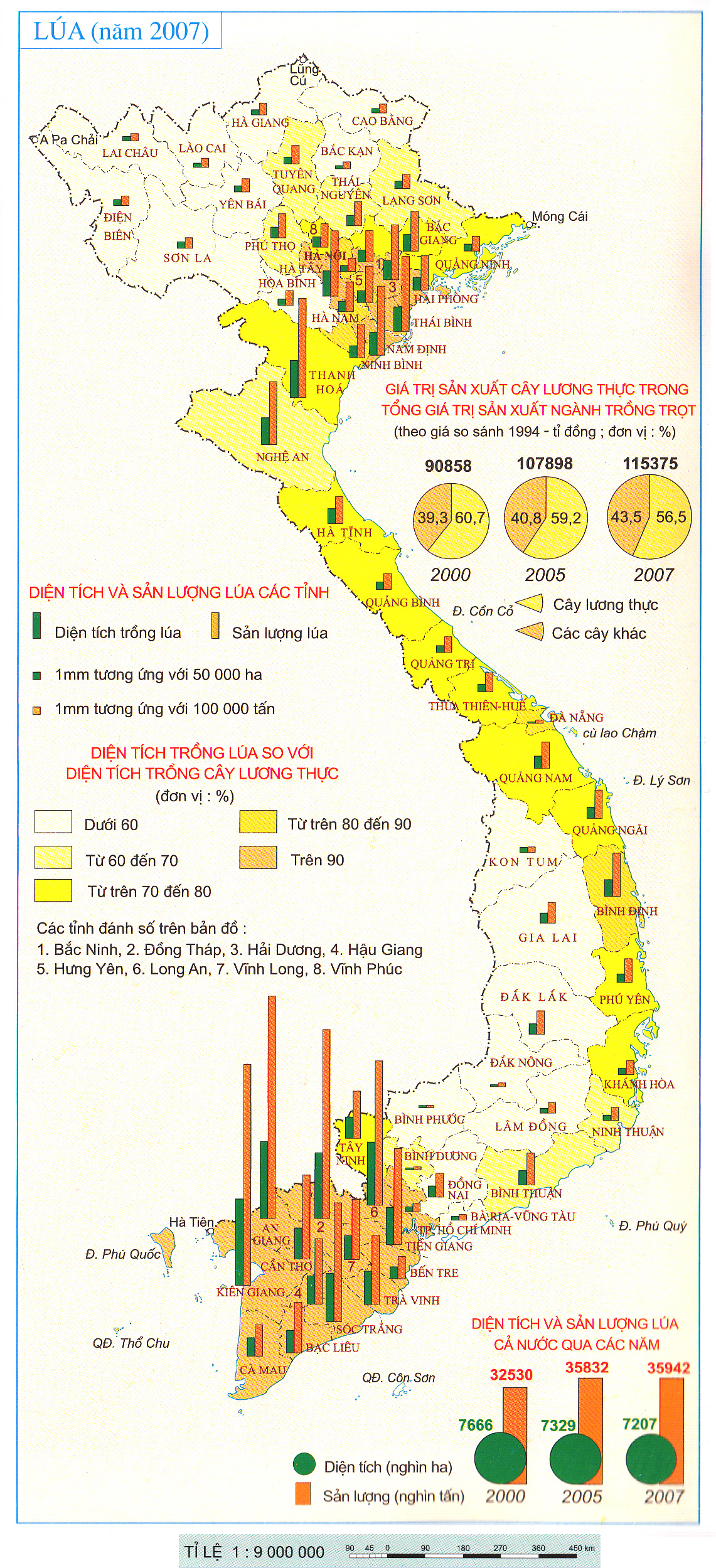 Từ bản đồ này có thể nhận định được các vùng trọng điểm lúa (Đồng bằng sông Hồng, Đồng bằng sông Cửu Long), các tỉnh có sản lượng lúa lớn nhất (Kiên Giang, An Giang, Cần Thơ, Đồng Tháp, Long An)…