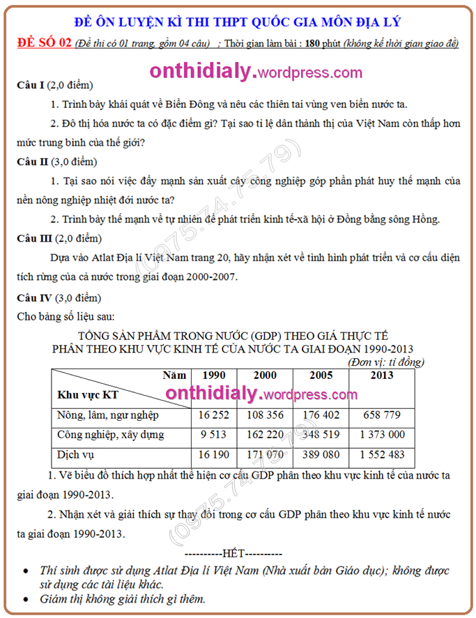 ĐỀ LUYỆN THI MÔN ĐỊA LÝ KÌ THI THPT QUỐC GIA ĐỀ SỐ 02 |