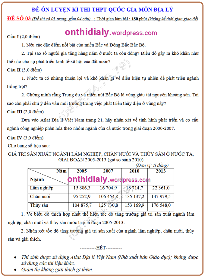 Đề và Đáp án (số 3), luyện thi môn Địa Lý kì thi THPT quốc gia