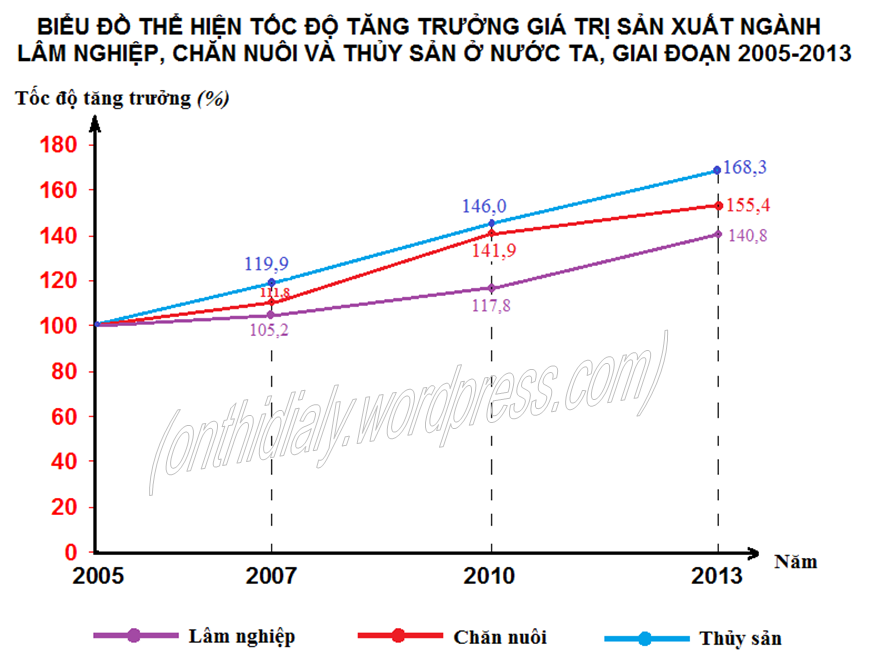 Biểu đồ thể hiện tốc độ tăng trưởng giá trị sản xuất ngành lâm nghiệp, chăn nuôi và thủy sản Việt Nam, giai đoạn 2005-2013.