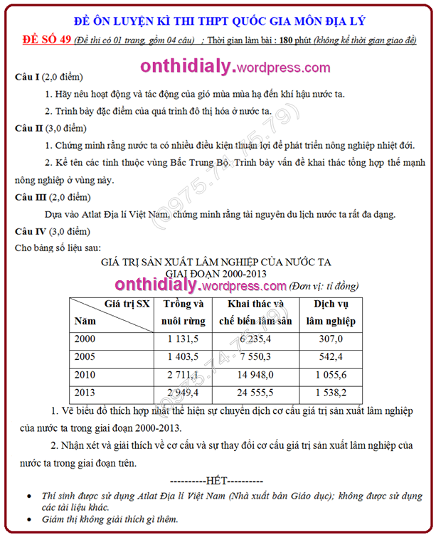 22/04/201516/08/2018Ôn Thi Địa Lý - Geography Đề luyện thi số 49, môn Địa Lý kì thi THPT quốc gia ĐỀ LUYỆN THI MÔN ĐỊA LÝ KÌ THI THPT QUỐC GIA ĐỀ SỐ 49 Câu I (2,0 điểm) Hãy nêu hoạt động và tác động của gió mùa mùa hạ đến khí hậu nước ta. Trình bày đặc điểm của quá trình đô thị hóa ở nước ta. Chia sẻ: Chia sẻ trên WhatsApp (Mở trong cửa sổ mới) WhatsApp Thêm In (Mở trong cửa sổ mới) In Chia sẻ trên Reddit (Mở trong cửa sổ mới) Reddit Chia sẻ trên Telegram (Mở trong cửa sổ mới) Telegram Gửi email một liên kết cho bạn (Mở trong cửa sổ mới) Email Chia sẻ trên TumblrTúiThích Đang tải... Có liên quan
