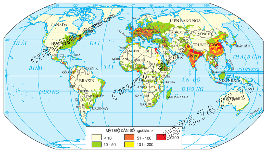 Dựa vào hình 25 (trang 98 SGK Địa lý 10) hoặc Bản đồ Phân bố dân cư và các đô thị lớn trên thế giới và bảng 22 (trang 87,88 SGK Địa lý 10):