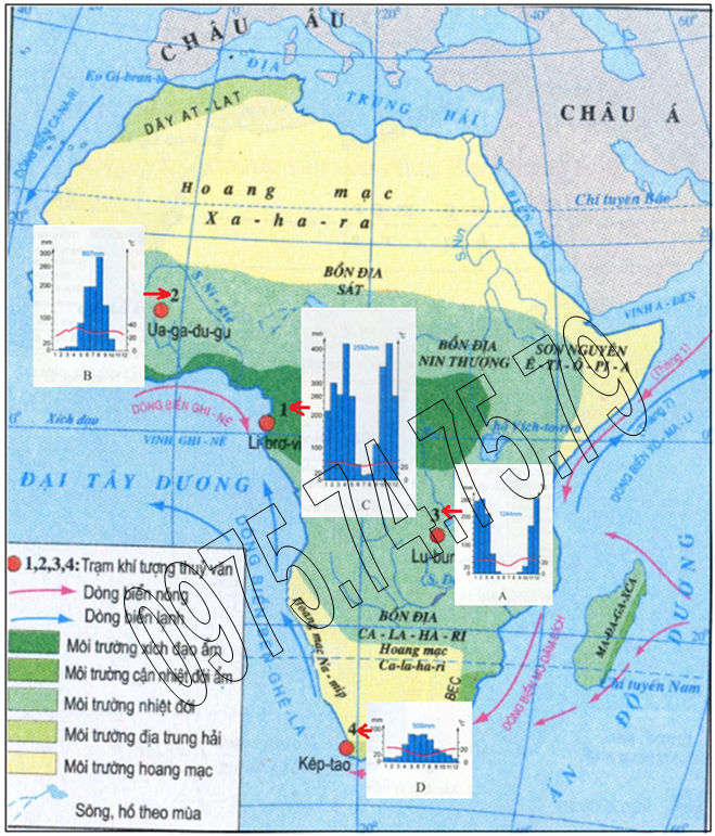 Sắp xếp các biểu đồ nhiệt độ và lượng mưa A, B, C, D (trang 88 SGK Địa lý 7) vào các vị trí đánh dấu 1, 2, 3, 4 trên hình 27.2 (trang 86 SGK Địa lý 7) sao cho phù hợp.