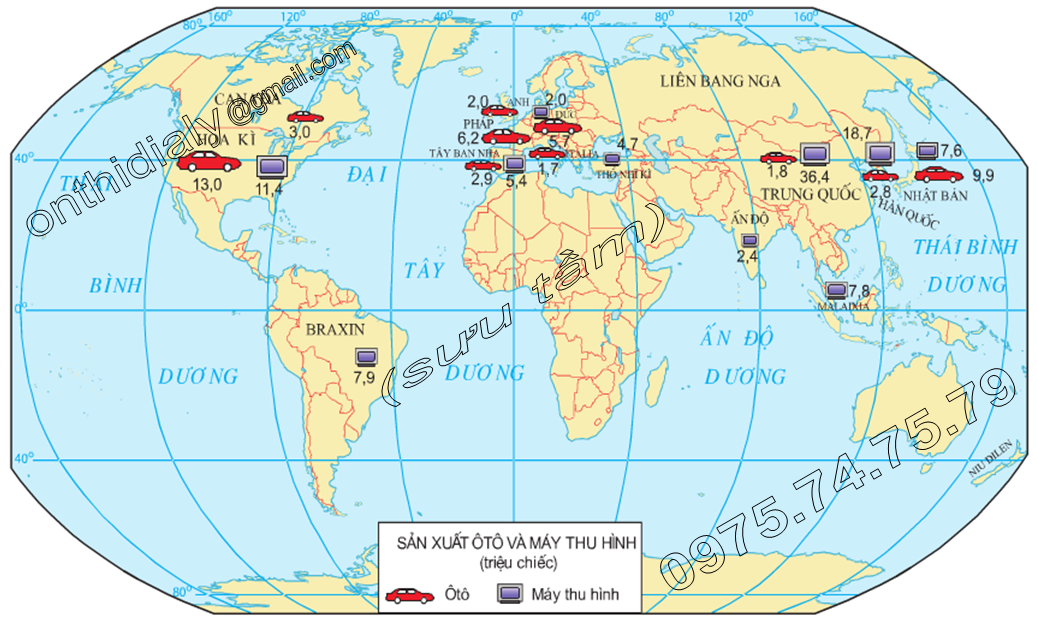 – Sản xuất ô tô và máy thu hình tập trung chủ yếu ở các nước có nền kinh tế phát triển (Hoa Kì, Ca-na-đa, Anh, Pháp, Đức, I-ta-li-a, Nhật Bản) và các nước Trung Quốc, Ấn Độ, Hàn Quốc, Bra-xin, Tây Ban Nha, Ma-lai-xi-a.