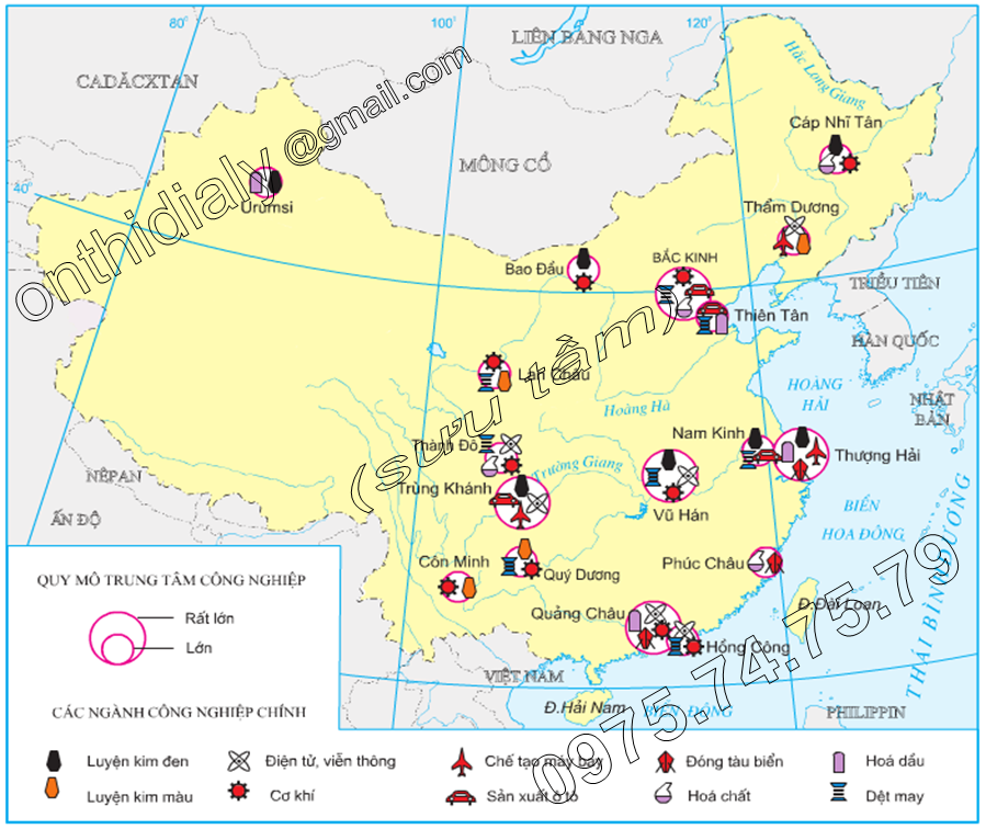 – Các trung tâm công nghiệp chính tập trung ở miền đông, các vùng duyên hải tại các thành phố lớn: Bắc Kinh, Thượng Hải, Thiên Tân, Trùng Khánh, Thẩm Dương, Quảng Châu …