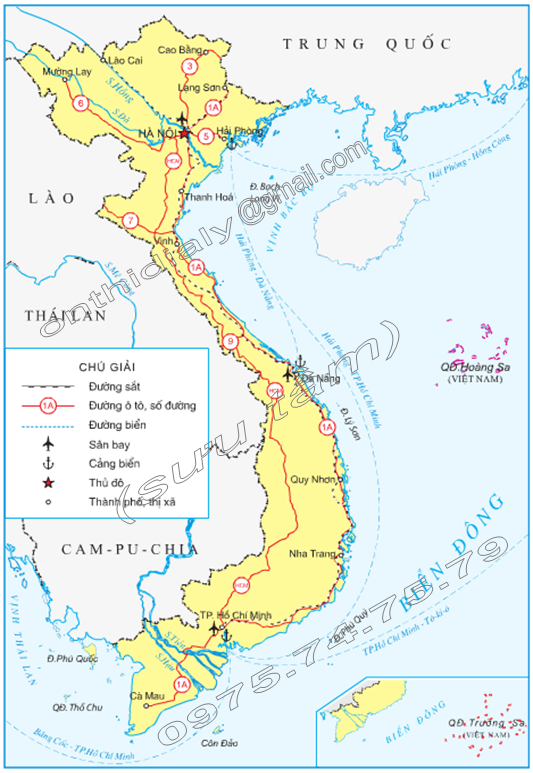 Các em dựa trên hình 2 để xác định vị trí của: quốc lộ 1A, đường sắt Bắc-Nam; các sân bay quốc tế: Nội Bài (Hà Nội), Tân Sơn Nhất (TP.Hồ Chí Minh), Đà Nẵng; các cảng biển: Hải Phòng, Đà Nẵng, TP.Hồ Chí Minh.