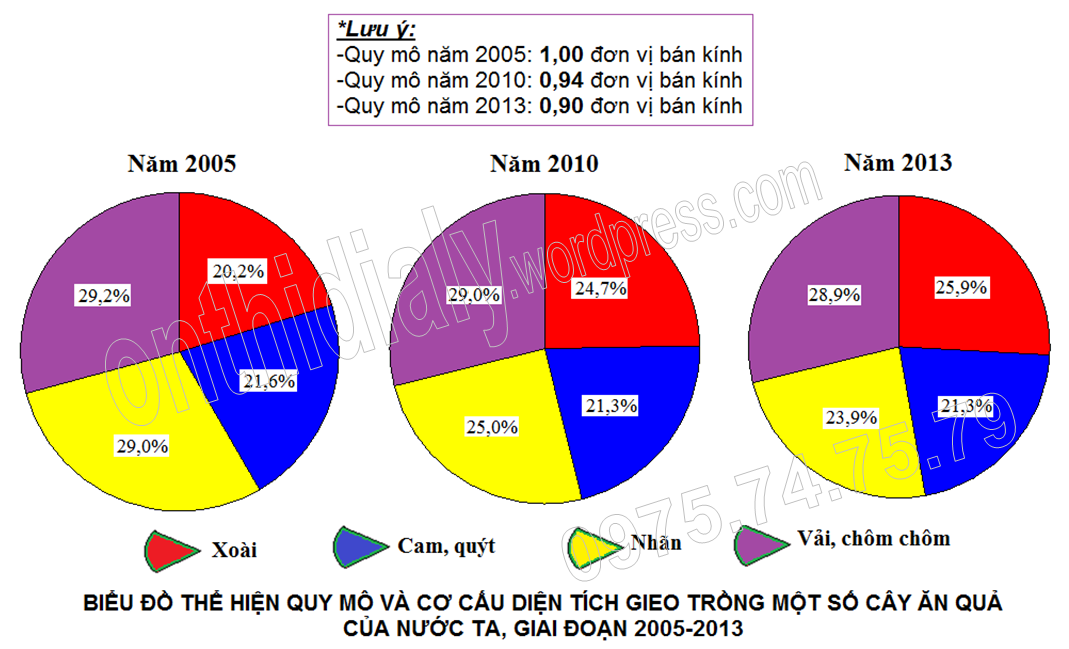 Biểu đồ thể hiện quy mô và cơ cấu diện tích gieo trồng một số cây ăn quả Việt Nam, giai đoạn 2005-2013