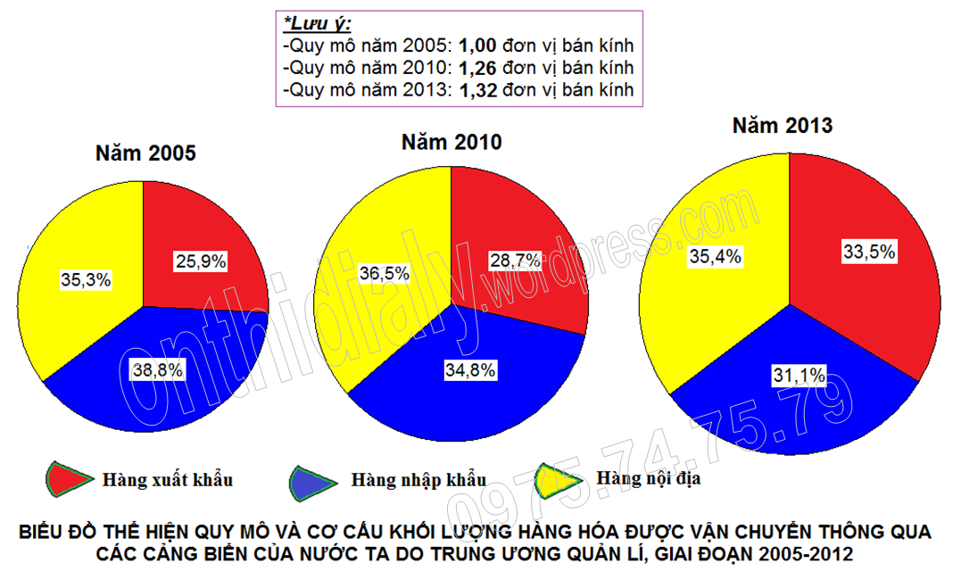 Biểu đồ thể hiện quy mô và cơ cấu khối lượng hàng hóa vận chuyển thông qua các cảng biển của Việt Nam do Trung ương quản lí, giai đoạn 2005-2012