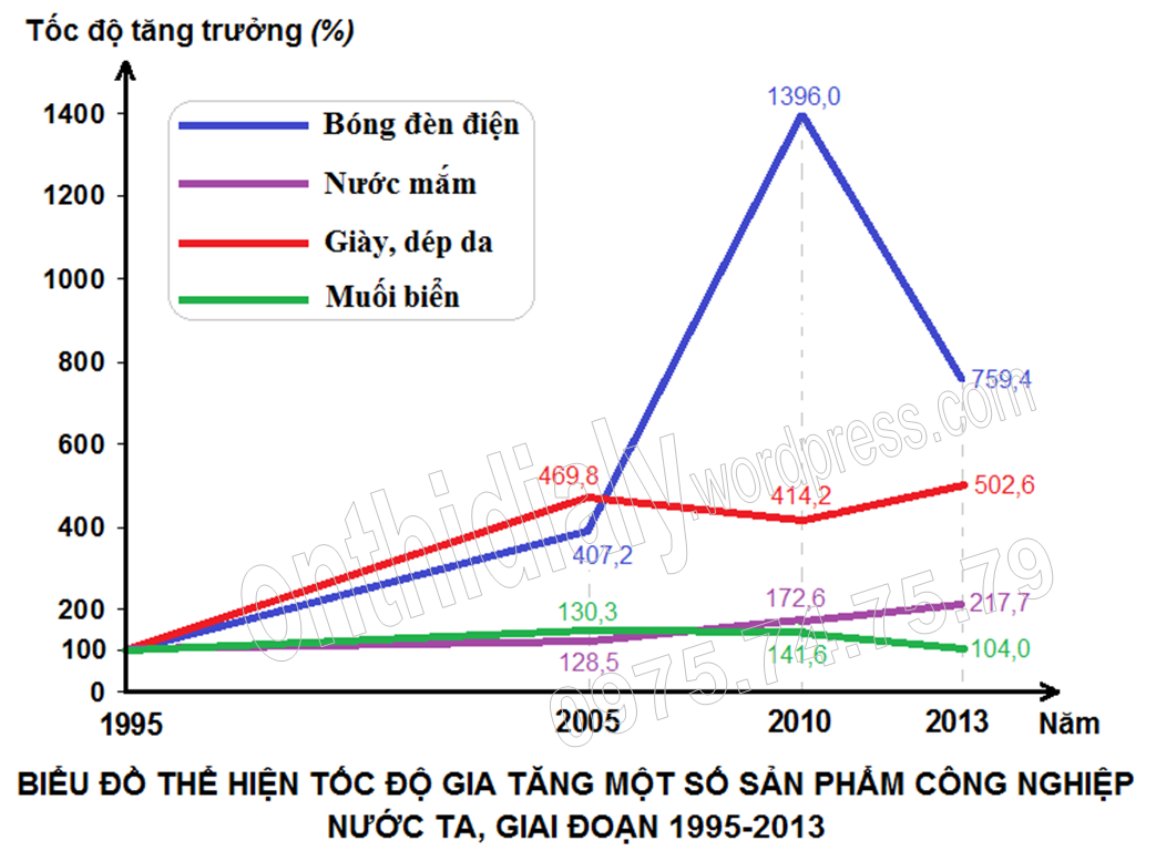 Biểu đồ thể hiện tốc độ gia tăng một số sản phẩm của ngành công nghiệp Việt Nam, giai đoạn 1995-2013