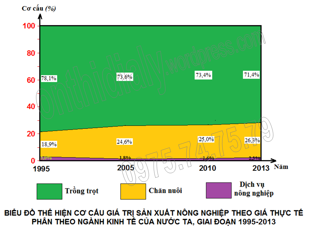 Biểu đồ thể hiện sự thay đổi cơ cấu giá trị sản xuất nông nghiệp theo giá thực tế phân theo ngành của Việt Nam, giai đoạn 1995-2013.