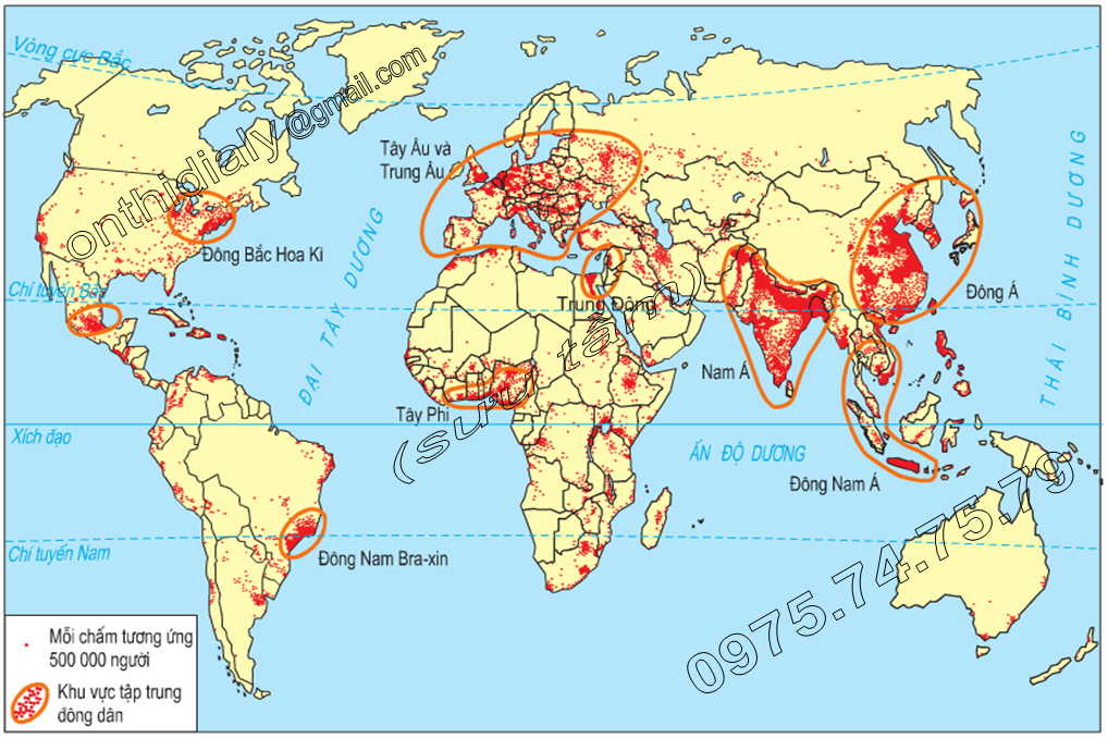 – Dân cư trên thế giới tập trung ở các khu vực Nam Á, Đông Nam Á, Đông Á, Tây Âu, ven vịnh Ghi-nê, đông bắc Hoa Kì, nam Mê-hi-cô, đông nam Bra-xin.