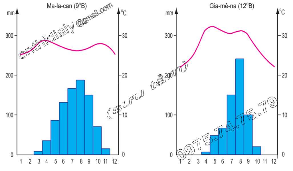 Hinh 6.1 và 6.2. Biểu đồ nhiệt độ và lượng mưa ở Ma-la-can (Xu-đăng) và ở Gia-mê-na (Sát)