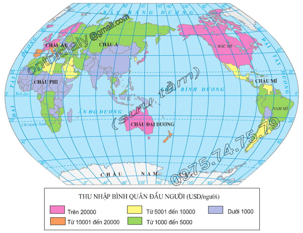 Hinh 25.1. Lược đồ thu nhập bình quân đầu người của các quốc gia trên thế giới (năm 2000)