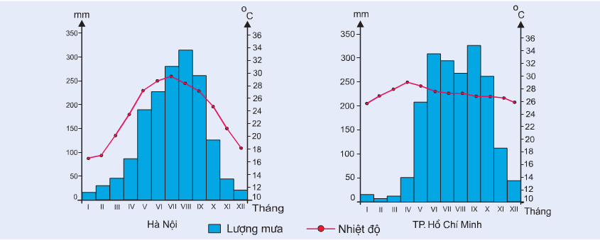 Biểu đồ nhiệt độ và lượng mưa ở Hà Nội và TP.Hồ Chí Minh