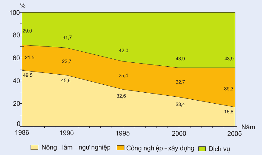 – Tỉ trọng giá trị sản xuất của nông, lâm, ngư nghiệp giảm, công nghiệp – xây dựng tăng, dịch vụ có nhiều biến chuyển trên cơ sở đảm bảo tăng trưởng KT với tốc độ nhanh, hiệu quả cao gắn với việc giải quyết các vấn đề XH và môi trường. Cụ thể, từ năm 1986 đến năm 2005 :