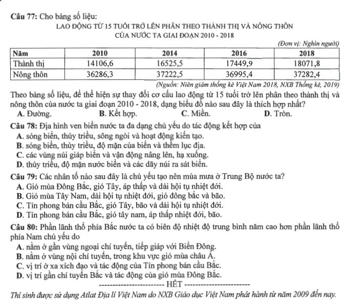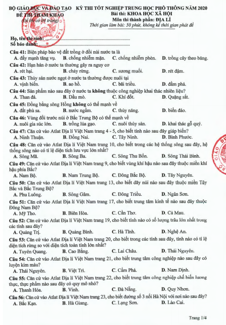 Đề thi (và đáp án) tham khảo môn Địa Lý kỳ thi tốt nghiệp THPT năm 2020