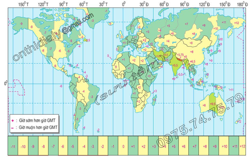 ? (trang 21 SGK Địa lý 10) Căn cứ vào bản đồ các múi giờ, hãy tính giờ và ngày ở Vệt Nam, biết rằng ở thời điểm đó, giờ GMT đang là 24 giờ ngày 31- 12?