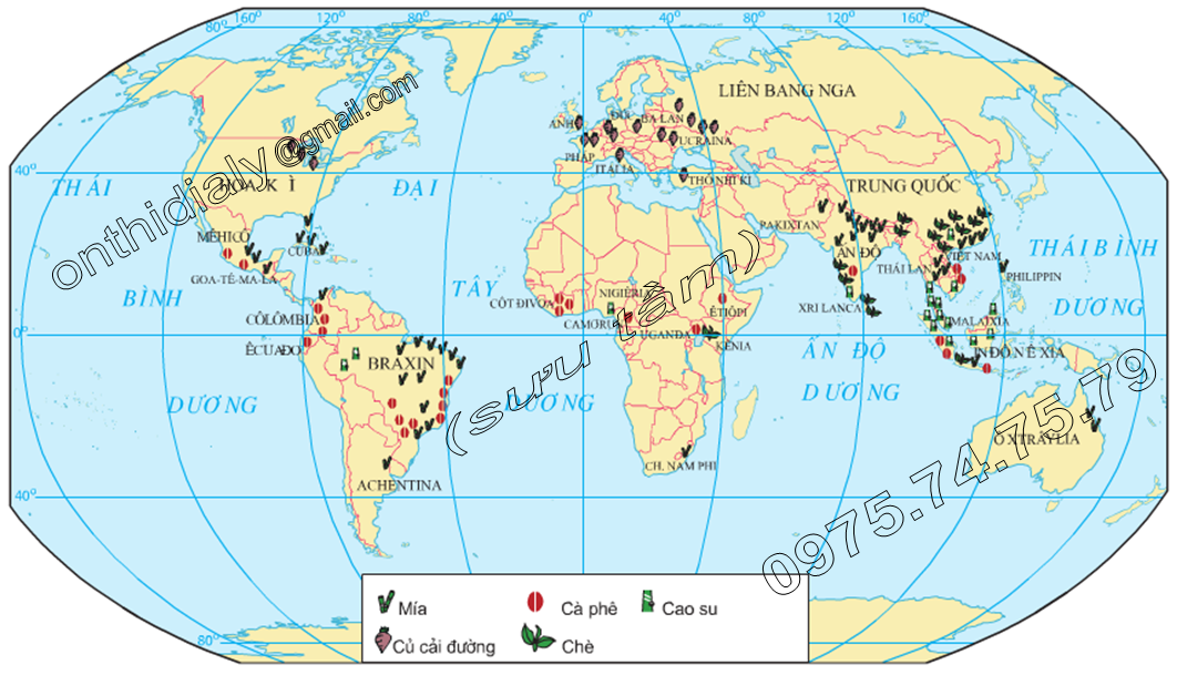 Hinh 28.5. Phân bố các cây công nghiệp chủ yếu trên thế giới