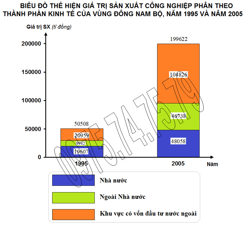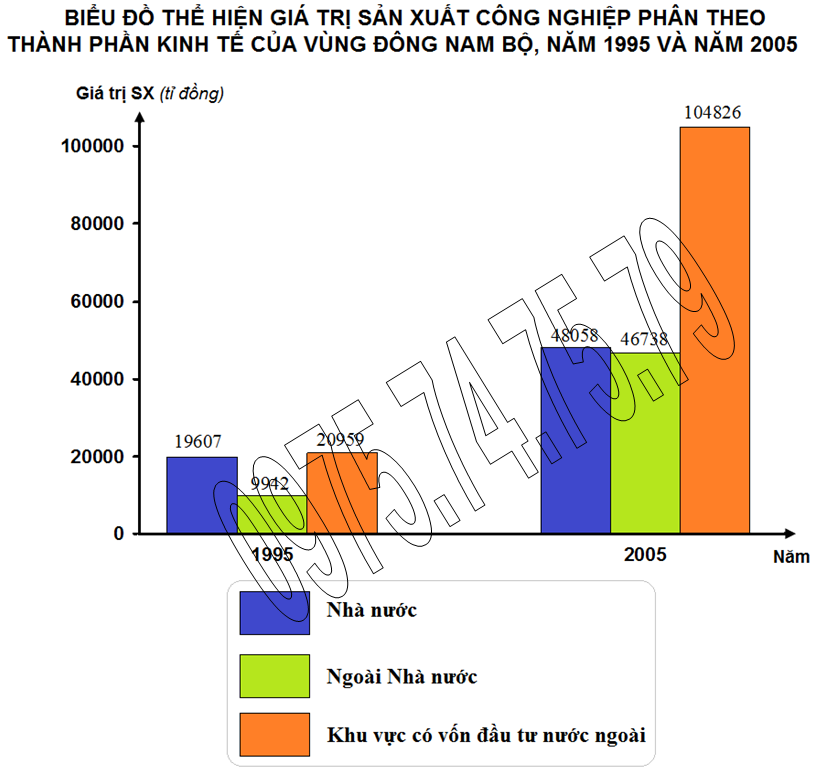 + Khu vực ngoài Nhà nước tăng gấp 4,7 lần (từ 9.942 tỉ đồng năm 1995 lên 46.738 tỉ đồng năm 2005), cao hơn mức tăng giá trị sản xuất công nghiệp của vùng (3,95 lần).