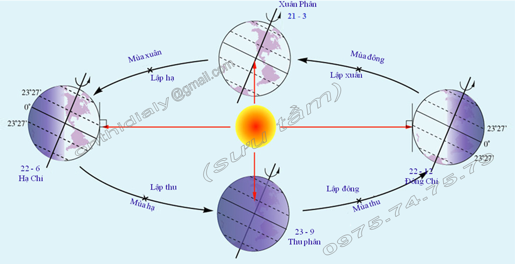 Hinh 23. Sự vận động của Trái Đất quanh Mặt Trời và các mùa ở Bắc bán cầu