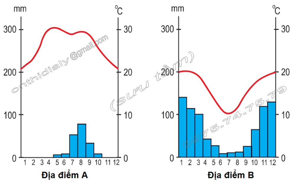 – Biểu đồ A: là biểu đồ của địa điểm ở nửa cầu Bắc. Vì có mùa nóng vào tháng 4, 5 (ngày Hạ chí 22/6 là mùa hạ ở nửa cầu Bắc và là mùa đông ở nửa cầu Nam).