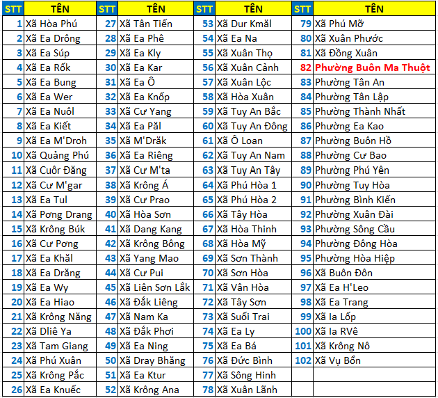 82. Sắp xếp toàn bộ diện tích tự nhiên, quy mô dân số của các phường Thành Công, Tân Tiến, Tân Thành, Tự An, Tân Lợi và xã Cư Êbur thành phường mới có tên gọi là phường Buôn Ma Thuột.